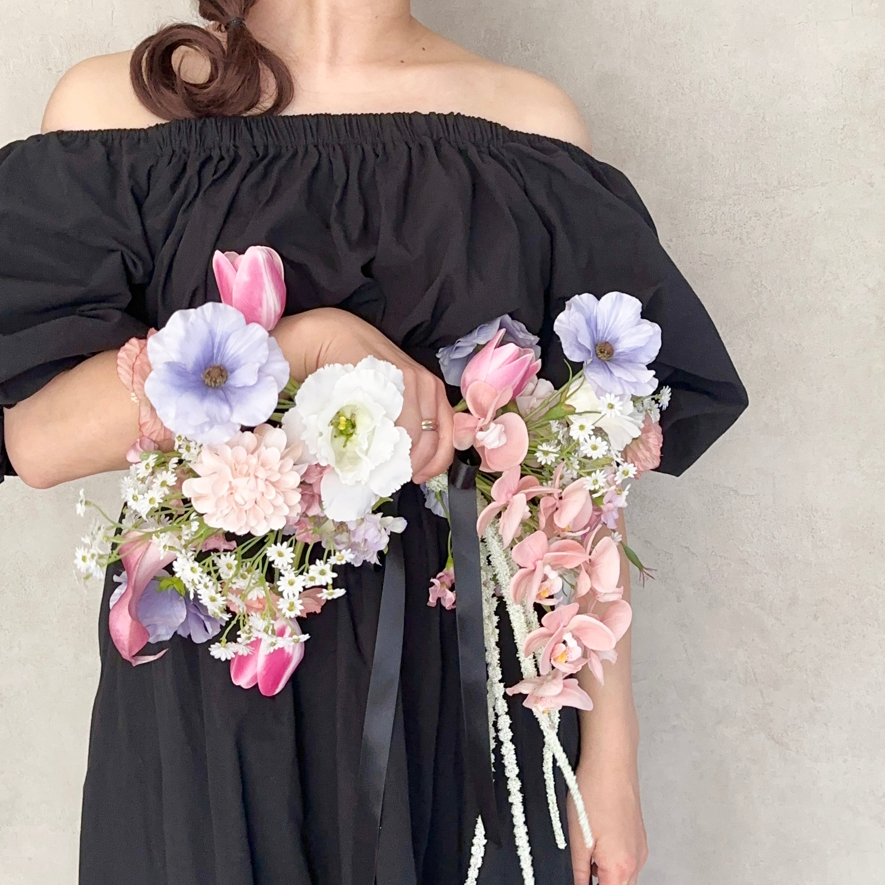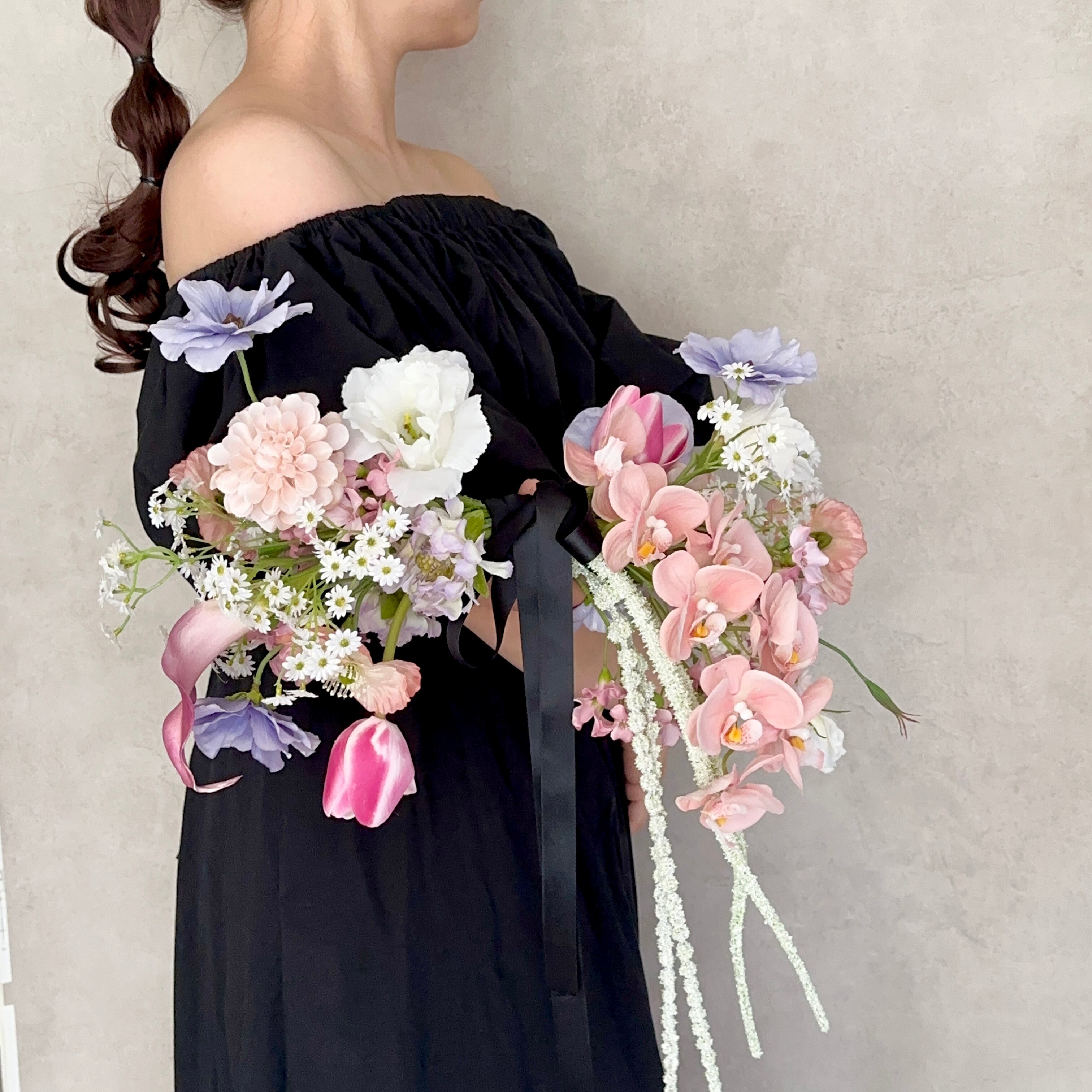 胡蝶蘭や、カラー、チューリップにダリアなど、バランスを考えてリボンの形に。